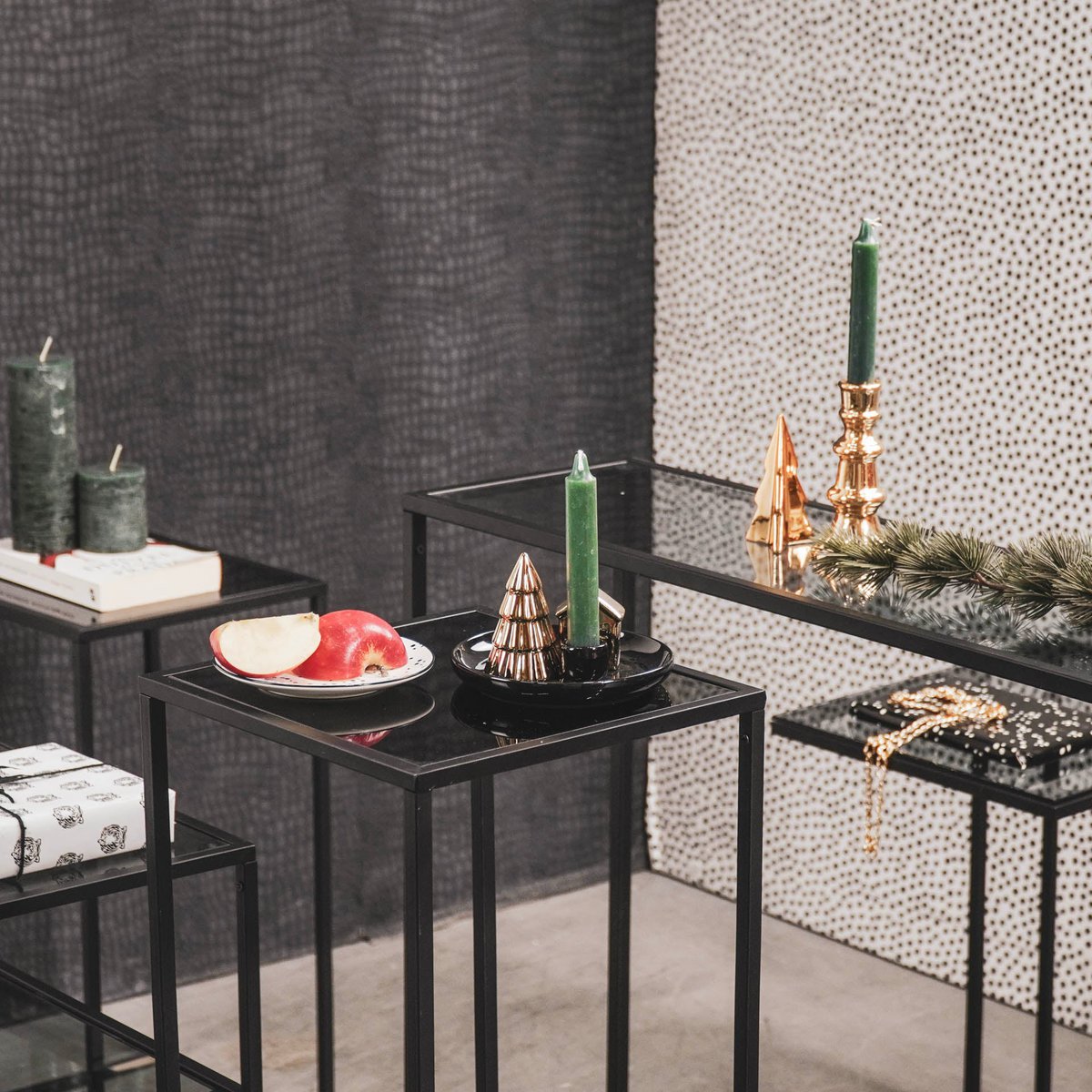 Maak de styling af door kleine kerst-items op het bord te leggen.